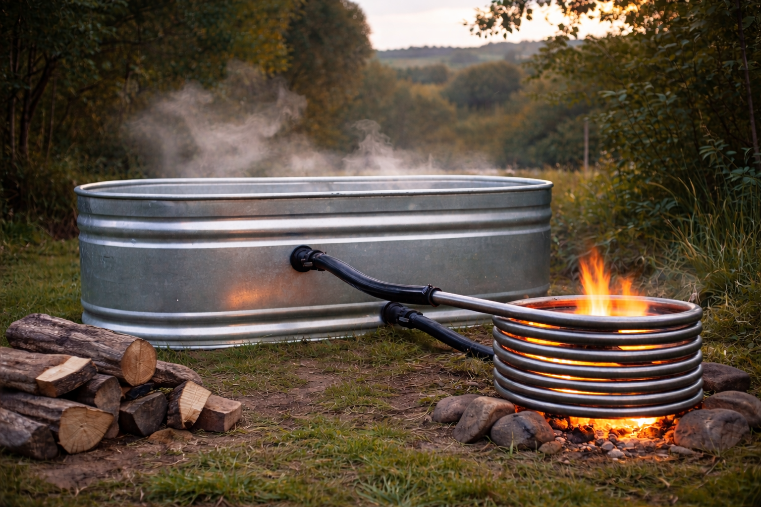 We've reimagined relaxtion. Our Fireflow stainless steel coil transforms any water-tight container into a beautifully simple wood-fired hot tub.
